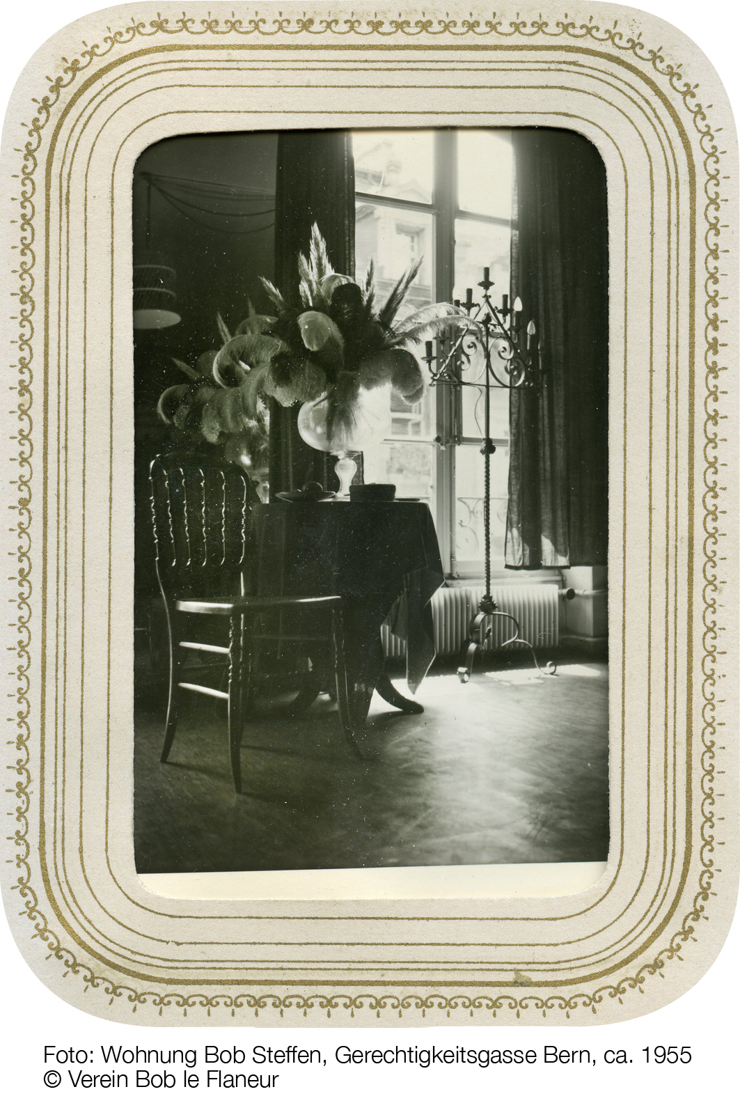 Bob Steffen hat seinen Beruf auch privat ausgelebt. Für die Ausstellung inspirierten wir uns an der Einrichtung seiner letzten Wohnung. Bis kurz vor seinem Tod hat Bob an der Gutenbergstrasse in Bern gelebt und die Zimmer mit Liebhaber-Objekten extravagant und opulent eingerichtet. Die theatralische Atmosphäre dieser ungewöhnlichen Bleibe haben wir mit Mobiliar, Schmuck, Nippes re-inszeniert. Nachgebaute Schaufenster illustrierten seine Arbeiten, Schrifttafeln informierten über die Stationen seiner Biografie, Hörstationen und Visuals hauchten ihr zusätzliches Leben ein. Neben dem umfangreichen fotografischen Archiv konnten wir auf Videoaufnahmen und Toninterviews mit Bob Steffen zurückgreifen. An seinem «Abschieds-Fest» im April 2012 haben wir Gespräche mit Freundinnen und ehemaligen Mitarbeitern aufgenommen.